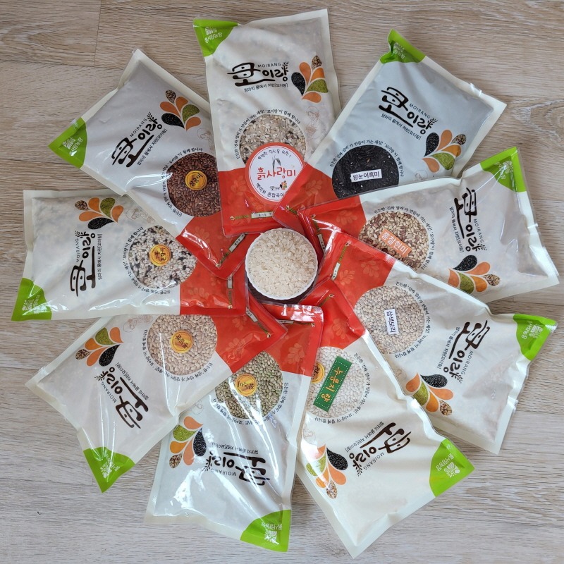(찰홍미+찰흑미+찰녹미+찹쌀+7종혼합곡+홍찰현미+흙사랑미+통밀쌀+삼색보리)9종을 소포장한 세트상품입니다